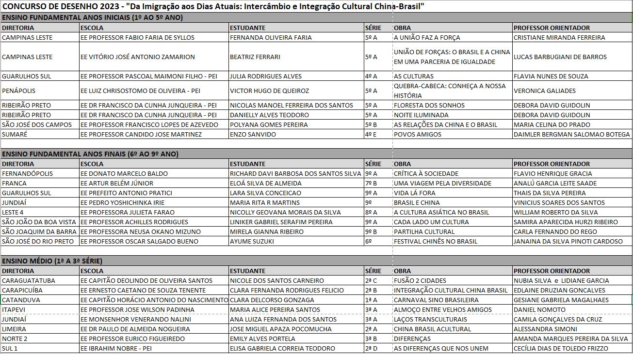 O Consulado-Geral da República Popular da China em São Paulo em parceria com a Secretaria da Educação do Estado de São Paulo (SEDUC-SP), por intermédio da Escola de Formação e Aperfeiçoamento dos Profissionais da Educação do Estado de São Paulo “Paulo Renato Costa Souza” (EFAPE) e o Centro de Referência em Educação Mario Covas (CREMC) em articulação com a Coordenadoria Pedagógica (COPED) com o intuito de disseminar a cultura chinesa no Brasil, promovem o Concurso de Desenho 2023.