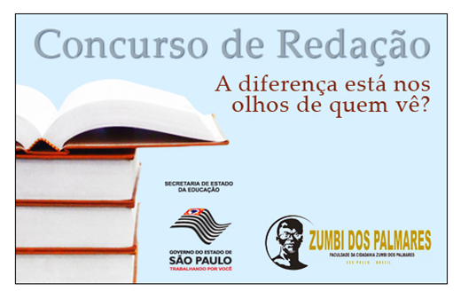 Esta página traz informações sobre o Concurso de Redação / 2008 “A diferença está nos olhos de quem vê?”, promovido pela SEE-SP, com o apoio institucional da Faculdade da Cidadania Zumbi dos Palmares. O presente concurso se insere nas atividades do Dia da Consciência Negra , em 20 de novembro. Poderão participar do Concurso alunos do 2º ano e 3º ano do Ensino Médio regular e Educação de Jovens e Adultos, da rede pública estadual da cidade de São Paulo.